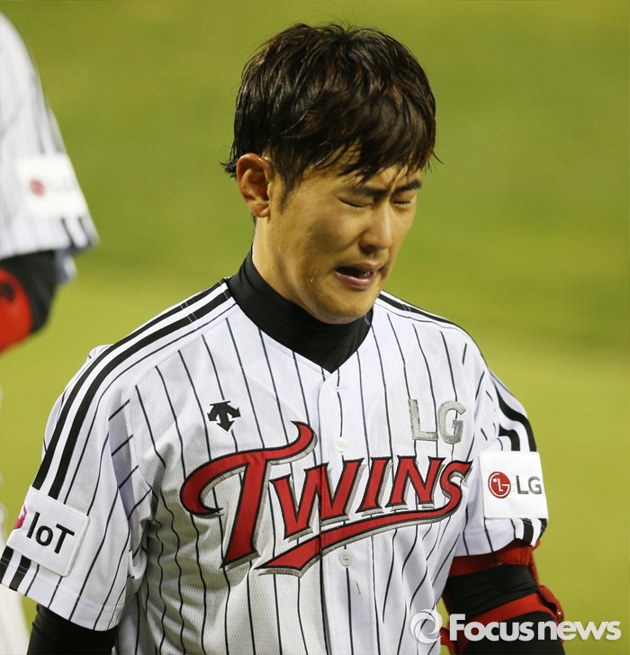 (서울=포커스뉴스) 12일 서울 잠실구장에서 열린 2016 프로야구 롯데-LG 경기 연장 10회말 1사 만루에서 중견수 희생플라이로 경기를 끝낸 LG 정주현이 감격에 겨워하고 있다.