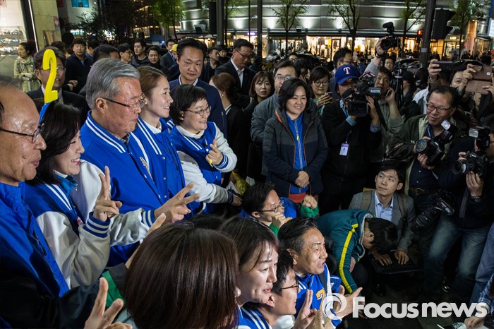 (서울=포커스뉴스) 20대 총선을 하루 앞둔 12일 오후 서울 중구 신평화시장 일대에서 김종인 더불어민주당 비상대책위원회 대표를 비롯한 비례대표 후보들과 마지막 선거유세를 하고 있다.
