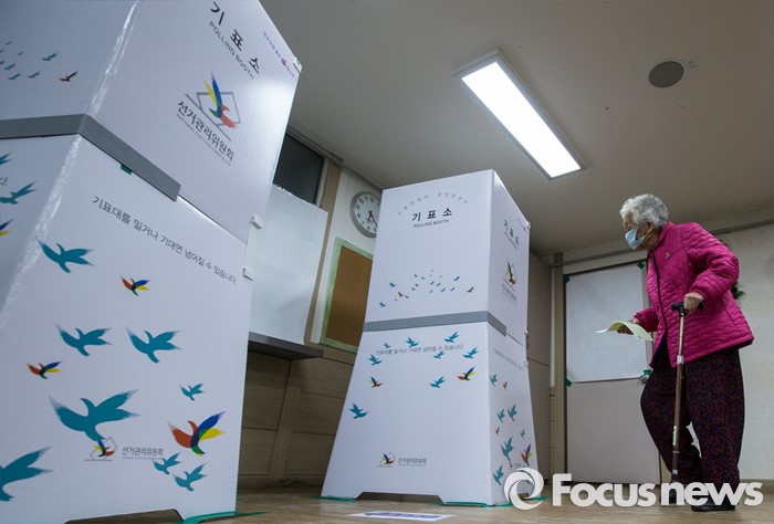 (부산=포커스뉴스) 제20대 국회의원선거일인 13일 오전 부산 영도구 동삼1동 제6투표소에서 지팡이를 짚은 노인이 기표소로 향하고 있다.