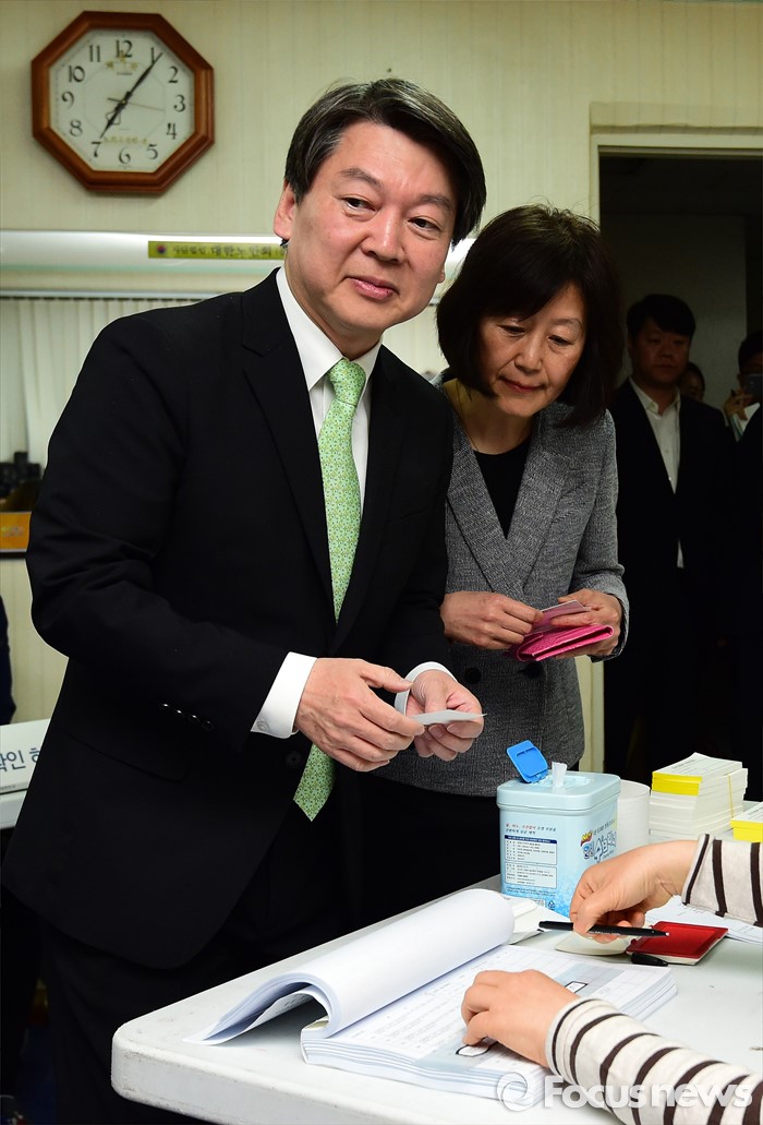 (서울=포커스뉴스) 안철수 국민의당 상임공동대표가 제20대 국회의원선거날인 13일 서울 노원구 상계1동 제7투표소에서 부인 김미경 씨와 투표하기 위해 본인확인을 하고 있다.