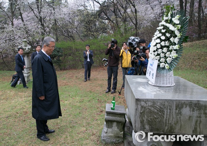 (서울=포커스뉴스) 20대 총선 투표일인 13일 오전 김종인 더불어민주당 비대위 대표 겸 선대위원장이 서울 강북구 수유동에 위치한 자신의 조부인 가인 김병로 선생 묘소를 찾아 성묘를 하고 있다.