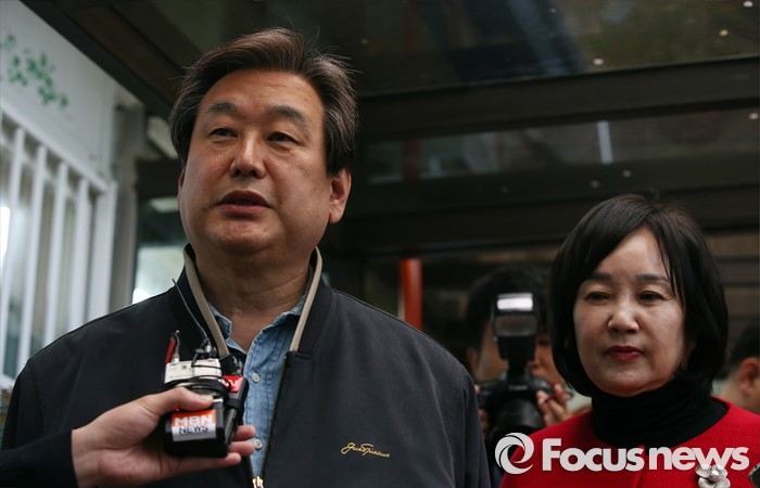 (부산=포커스뉴스) 제20대 국회의원선거일인 13일 오전 부산 영도구 동삼1동 제6투표소에서 김무성 새누리당 대표가 투표를 마친 후 취재진의 질문에 답하고 있다. 오른쪽은 부인 최양옥 씨.