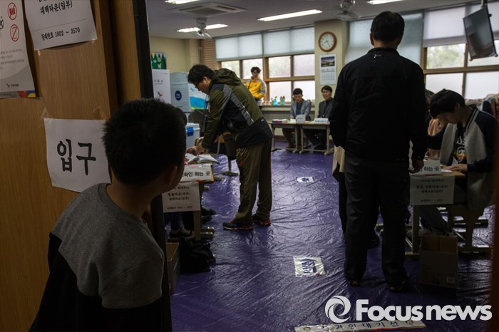 (대구=포커스뉴스) 제20대 국회의원선거날인 13일 오전 대구 수성구 청림초등학교에 마련된 투표소에서 한 어린이가 아버지의 투표하는 모습을 보고 있다.