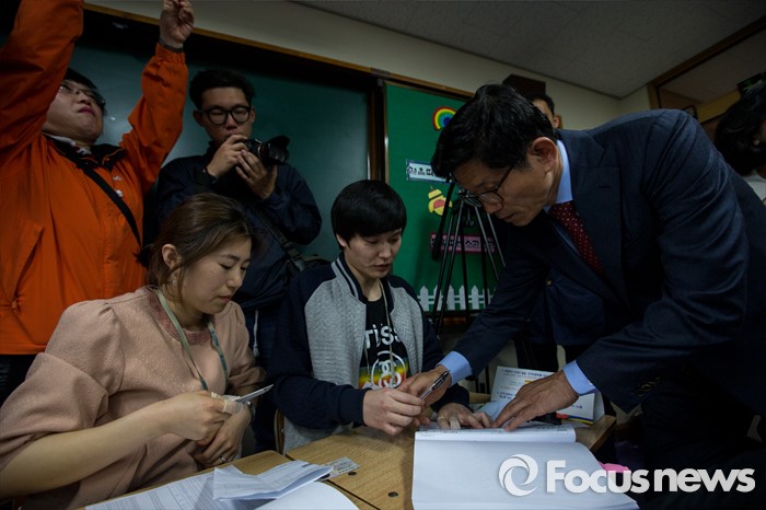 (대구=포커스뉴스) 제20대 국회의원선거날인 13일 오전 대구 수성구 청림초등학교에 마련된 투표소에서 김문수 새누리당 대구 수성구갑 후보가 투표를 하기 위해 선거인명부를 확인하고 있다.