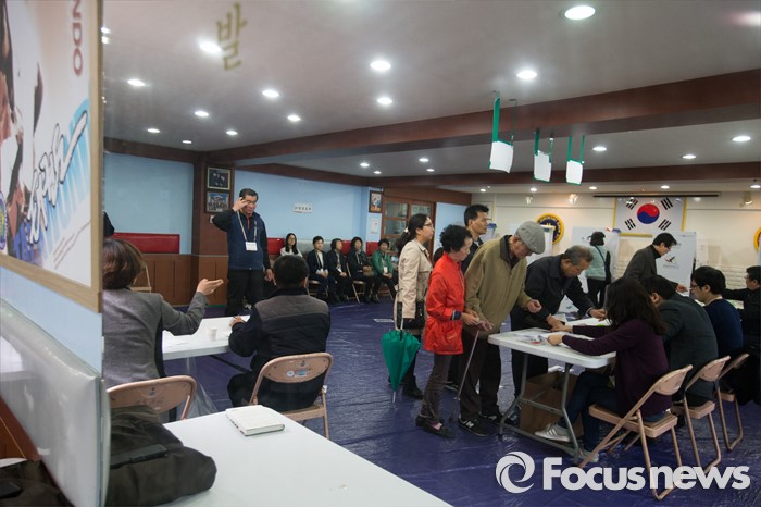 (서울=포커스뉴스) 제20대 국회의원선거일인 13일 오전 서울 강서구 화곡제8동 제5투표소에서 유권자들이 투표를 하기위해 본인확인절차를 밟고 있다.