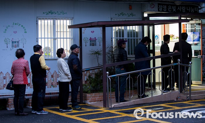 서울 동대문구 이문동 한국외대 대학원에 설치된 이문1동 제4·8 투표소 앞은 오전 5시 40분부터 유권자들이 줄지어 기다리고 있었다.