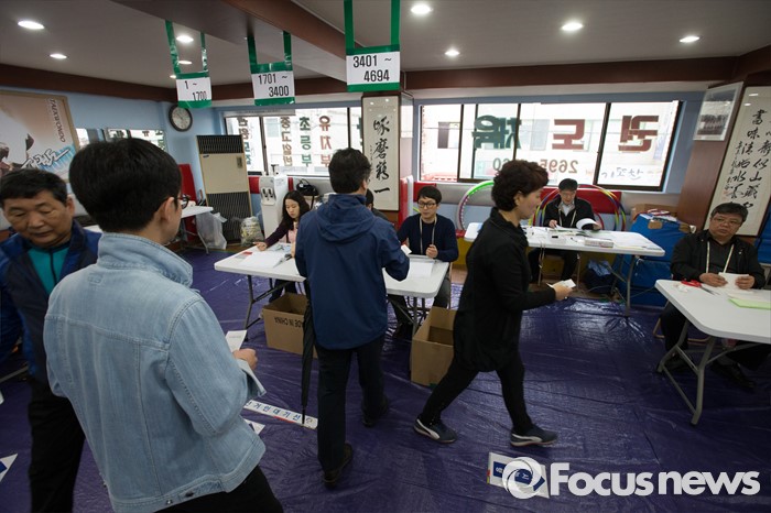 (서울=포커스뉴스) 제20대 국회의원선거일인 13일 오전 서울 강서구 화곡제8동 제5투표소에서 유권자들이 투표를 위해 본인확인절차를 밟고 있다.