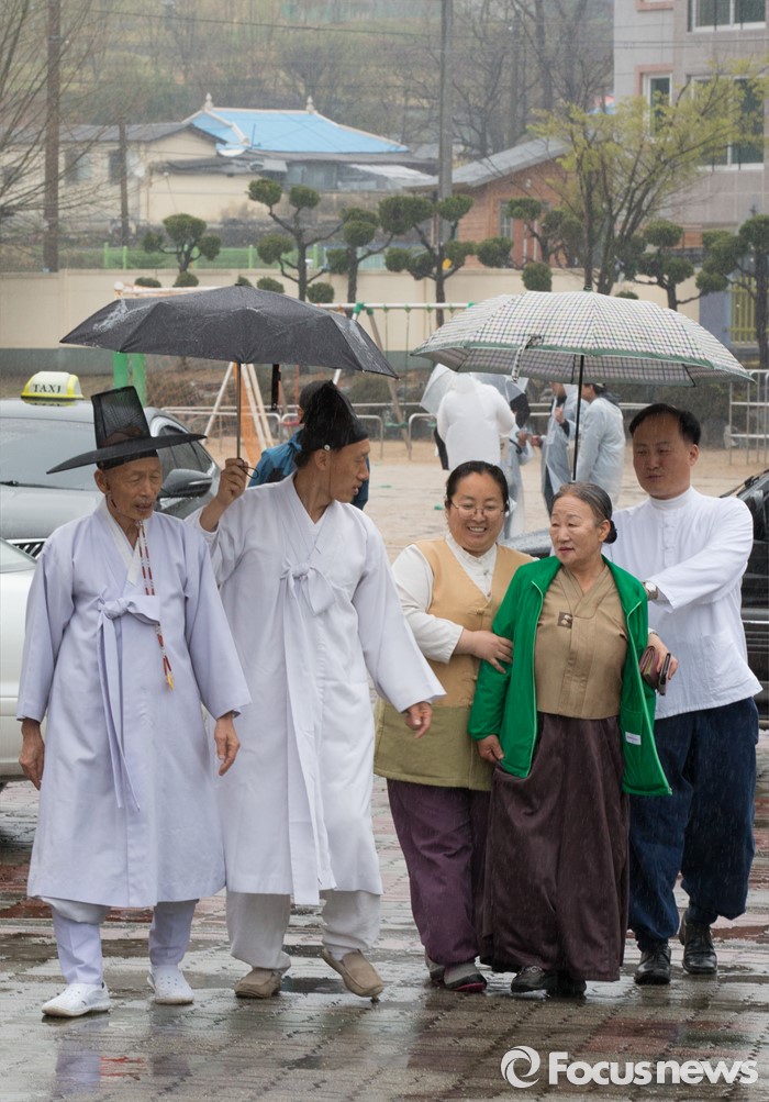 (논산=포커스뉴스) 제20대 국회의원 선거가 시작된 13일 오전 충남 논산 연산면 제1투표소에서 양지서당 유복엽 큰 훈장과 가족들이 투표를 마치고 투표소를 나서고 있다.