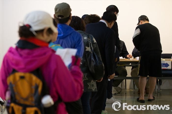 (서울=포커스뉴스) 2016 제20대 국회의원선거날인 13일 오전 서울 종로구 동성고등학교 백주년기념관에 설치된 투표소에서 유권자들이 투표를 하기 위해 본인확인을 하고 있다.