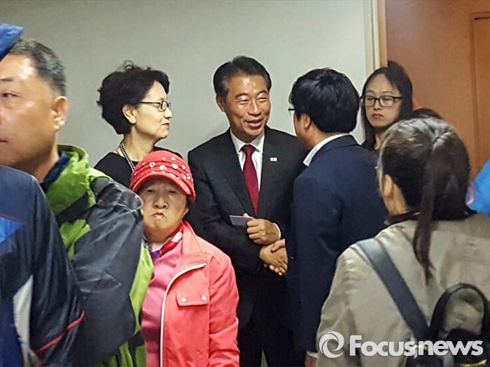 (대구=포커스뉴스) 제20대 국회의원선거날인 13일 오전 대구 동구 효목동에 마련된 투표소에서 정종섭 새누리당 동구갑 후보가 투표를 마친 뒤 주민들과 대화를 나누고 있다.