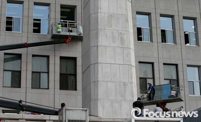(서울=포커스뉴스) 20대 총선 투표일인 13일 오후 서울 여의도 국회 본청에서 업체 관계자들이 창문교체 작업을 하고 있다.