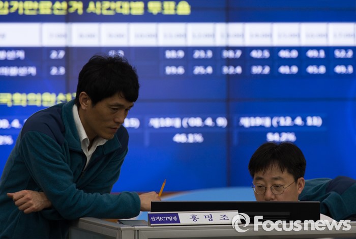 (서울=포커스뉴스) 제20대 국회의원선거일인 13일 오후 경기도 과천 중앙선거관리위원회에 마련된 선거상황실에서 직원들이 분주히 업무를 보고 있다.