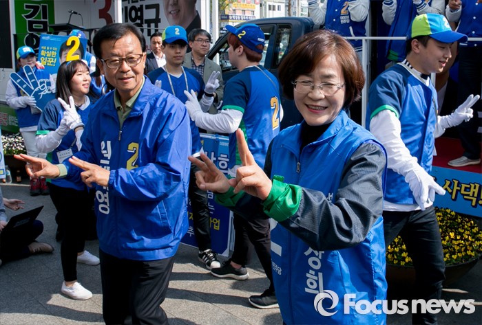 (서울=포커스뉴스) 13일 오후 6시 KBS·MBC·SBS 지상파 방송3사가 공동조사, 발표한 4·13 총선 출구조사 결과에 따르면 경기 부천오정 지역구에서는 더불어민주당 원혜영 후보가 44.4%로 당선이 예상된다.(부천=포커스뉴스) 20대 총선을 이틀 앞둔 11일 오후 경기도 부천역 남부광장에서 열린 더불어민주당 부천지역 합동유세에 참석한김상희 소사구 후보, 원혜영 오정구 후보 등이 로고송에 맞춰 율동을 선보이고 있다. 2016.04.11 박동욱 기자