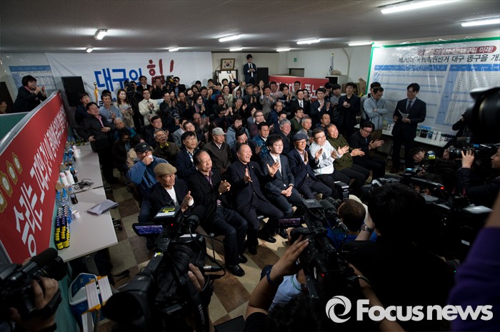 (대구=포커스뉴스) 제20대 국회의원선거 출구조사를 통해 유승민 무소속 대구 동구을 후보가 당선이 예측된 13일 오후 대구 동구 유 후보 선거사무소에서 유승민 후보가 지지자들의 축하를 받고 있다.