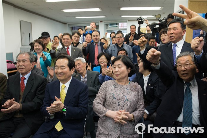 (서울=포커스뉴스) 제20대 국회의원선거일인 13일 오후 서울 종로구 정세균 더불어민주당 종로구 후보의 사무실에서 지지자들이 정 후보에게 환호를 보내고 있다.