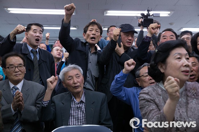 (서울=포커스뉴스) 제20대 국회의원선거일인 13일 오후 서울 종로구 정세균 더불어민주당 종로구 후보의 사무실에서 지지자들이 개표방송을 보고 환호하고 있다.