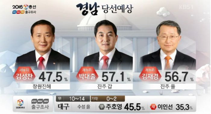 (서울=포커스뉴스)13일 오후 6시 KBS·MBC·SBS 지상파 방송3사가 공동조사, 발표한 4·13 총선 출구조사 결과에 따르면 경남 진주을 지역구에서는 김재경 새누리당 후보가 56.7%로 당선이 유력한 것으로 나타났다.<사진출처=KBS 출구방송 화면캡쳐>