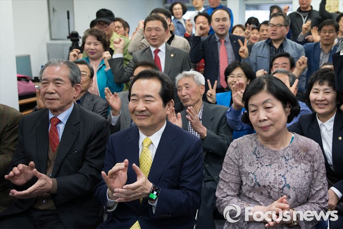 (서울=포커스뉴스) 제20대 국회의원선거일인 13일 오후 서울 종로구 정세균 더불어민주당 종로구 후보의 사무실에서 지지자들이 정 후보에게 환호를 보내고 있다.