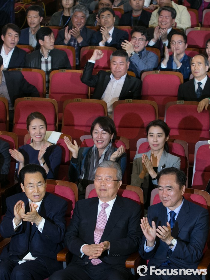 (서울=포커스뉴스) 20대 총선 투표일인 13일 오후 서울 여의도 국회 의원회관 대회의실에 마련된 더불어민주당 개표상황실에서 김종인 비대위 대표 겸 선대위원장과 선대위원들이 출구조사 및 개표방송을 시청하며 박수치고 있다. 앞줄 왼쪽부터 송현섭 부위원장, 김 대표, 정장선 총선기획단장.