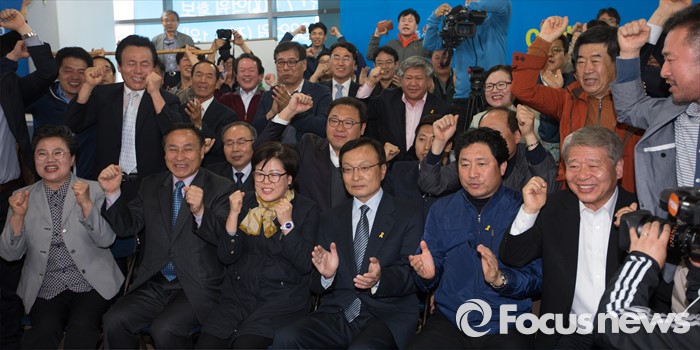 (세종=포커스뉴스) 제20대 국회의원선거가 마감된 가운데 이해찬 무소속 후보가 13일 오후 세종시 도담동 선거사무소에서 방송3사 출구조사 결과 앞서는 것으로 나타나자 지지자들과 함께 환호하고 있다.