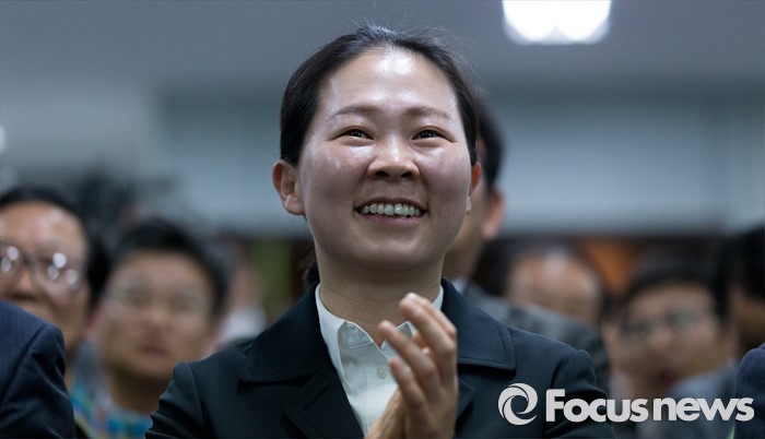 (광주=포커스뉴스) 제20대 국회의원 선거일인 13일 오후 광주 서구 국민의당 광주광역시당에서 권은희 광주 광산구을 후보가 출구조사 결과를 보며 박수 치고 있다.