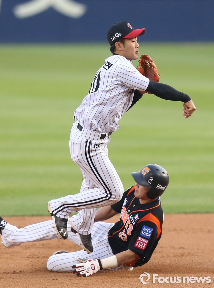 (서울=포커스뉴스) 13일 서울 잠실구장에서 열린 2016 프로야구 롯데-LG 경기 1회초 무사 1루에서 LG 2루수 정주현이 롯데 김문호의 3루 땅볼때 1루주자 정훈을 포스아웃 시킨후 1루로 송구해 병살을 성공시키고 있다.