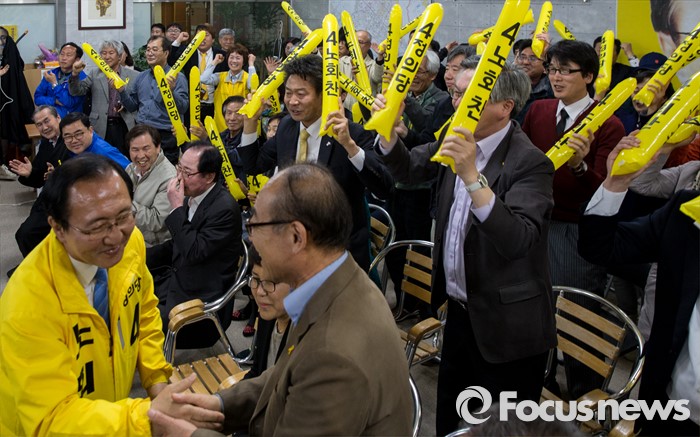 (창원=포커스뉴스) 제20대 국회의원선거가 끝난 13일 오후 창원시 성산구의 선거사무소에서 노회찬 정의당 창원 성산구 후보가 '예측 당선'이라는 방송사 출구조사 결과에 지지자들과 기쁨을 나누고 있다.