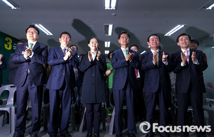 (광주=포커스뉴스) 제20대 국회의원 선거일인 13일 오후 광주 서구 국민의당 광주광역시당에서 국민의당 지역구 후보자들이 모여 출구조사 결과를 보고 기념촬영을 하고 있다. 왼쪽부터 송기석 서구갑 후보, 김경진 북구갑 후보, 권은희 광산구을 후보, 천정배 서구을 후보, 장병완 동구남구 갑 후보, 김성환 광주 동구청장 재선거 후보.