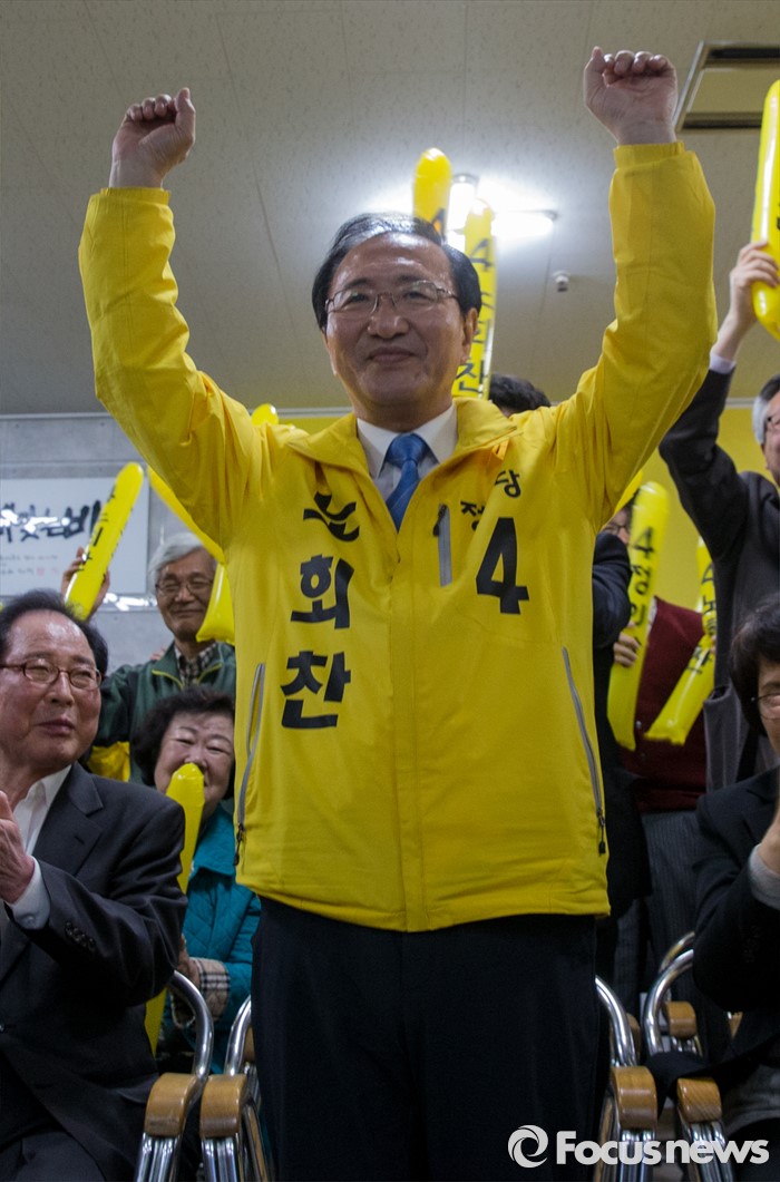 (서울=포커스뉴스) 13일 오후 6시 KBS·MBC·SBS 지상파 방송3사가 공동조사, 발표한 4·13 총선 출구조사 결과에 따르면 경남 창원성산에서는 노회찬 정의당 후보가 50.4%로 강기윤 새누리당 후보(42.3%)를 누르고 우세를 보였다.(창원=포커스뉴스) 제20대 국회의원선거가 끝난 13일 오후 창원시 성산구의 선거사무소에서 노회찬 정의당 창원 성산구 후보가 '예측 당선'이라는 방송사 출구조사 결과에 두 손을 번쩍 들고 있다. 노 후보의 좌측은 권영길 전 민주노동당 대표. 2016.04.13 양지웅 기자