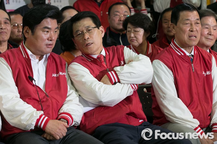 (서울=포커스뉴스) 제20대 국회의원 선거날인 13일 오후 서울 여의도 새누리당사에서 원유철(왼쪽) 원내대표와 이군현(가운데) 공동총괄본부장이 방송 3사의 출구조사를 시청하며 대화하고 있다. 오른쪽은 황진하 사무총장.