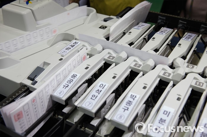 (서울=포커스뉴스) 제20대 국회의원선거일인 13일 오후 서울 종로구 경기상업고등학교 체육관에 마련된 개표소에서 전자개표기가 투표용지를 분류하고 있다.