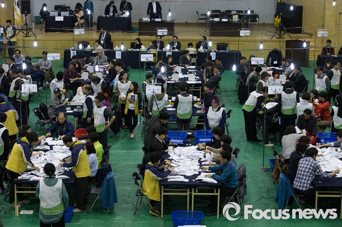 (서울=포커스뉴스) 제20대 국회의원선거일인 13일 오후 서울 종로구 경기상업고등학교 체육관에 마련된 개표소에서 종로구 선거관리위원회 관계자들이 개표하고 있다.