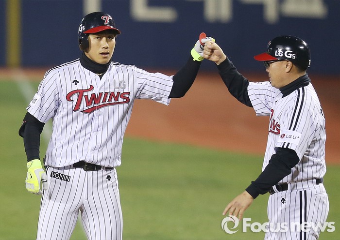 (서울=포커스뉴스) 13일 서울 잠실구장에서 열린 2016 프로야구 롯데-LG 경기 2회말 2사 만루에서 LG 이천웅이 2타점 중전안타를 치고 1루에서 한혁수 코치와 주먹을 마주치고 있다.