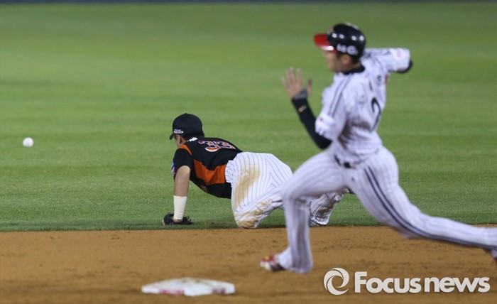 (서울=포커스뉴스) 13일 서울 잠실구장에서 열린 2016 프로야구 롯데-LG 경기 2회말 2사 만루에서 롯데 2루수 정훈이 LG 이천웅의 타구를 바라보고 있다. LG 1루주자 오지환이 2루 베이스를 통과하고 있다.
