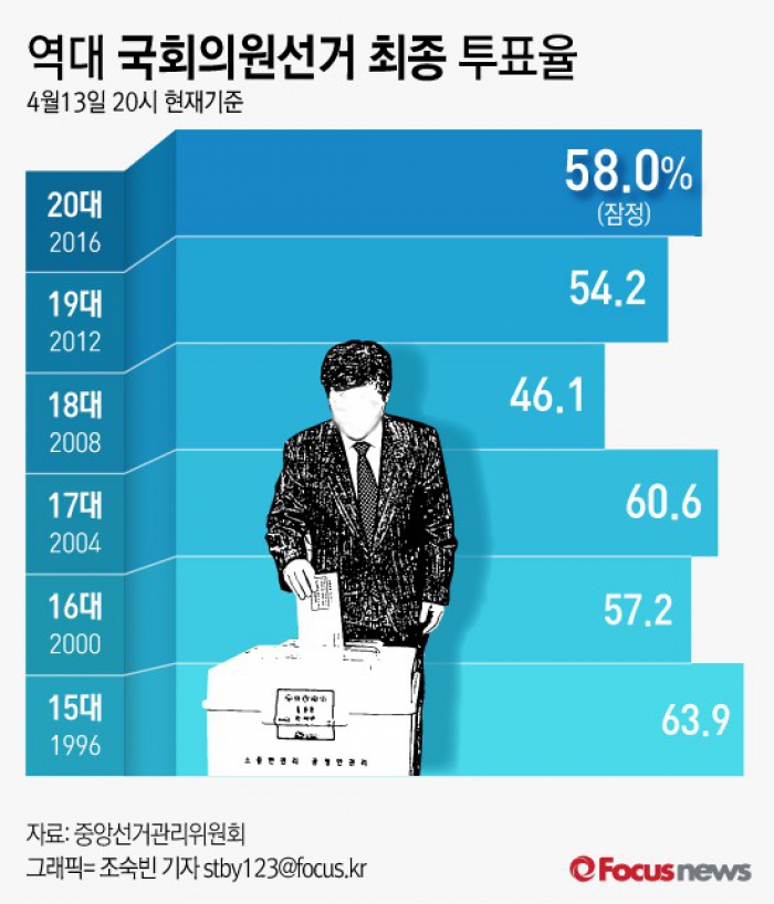 (서울=포커스뉴스) 4월 13일 치러진 제20대 국회의원선거 전국 최종 투표율은 (사전투표 투표율 12.2% 합산) 지난 19대 총선 54.2%보다 3.8% 높은 58.0%를 잠정 집계됐다.