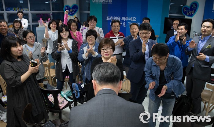 (용인=포커스뉴스) 제20대 국회의원 선거날인 13일 오후 경기도 용인시 기흥에 위치한 선거사무실에서 표창원 더불어민주당 용인정 후보가 '당선유력' 이라는 방송사 개표 상황을 확인하고 지지자들의 축하를 받고 있다.