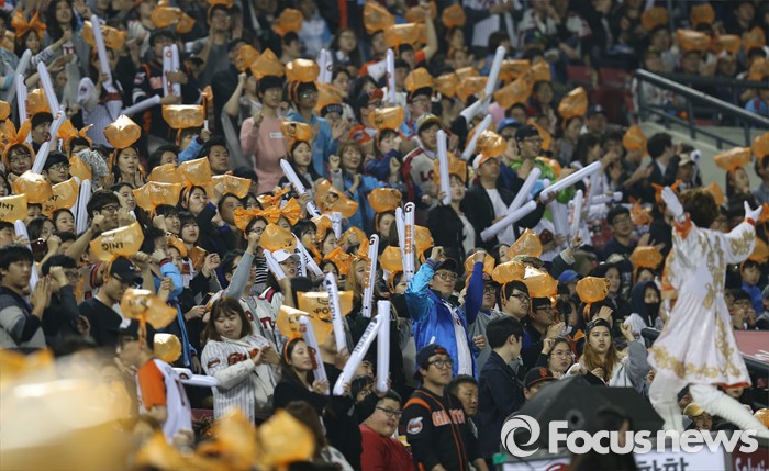 (서울=포커스뉴스) 13일 서울 잠실구장에서 열린 2016 프로야구 롯데-LG 경기에서 머리 위에 공기 한 봉지를 쓴 롯데 팬들이 응원단장의 지휘 아래 열렬한 응원을 하고 있다.