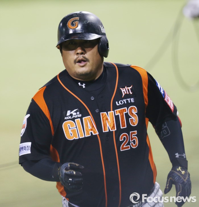 (서울=포커스뉴스) 13일 서울 잠실구장에서 열린 2016 프로야구 롯데-LG 경기 8회 1사후 롯데 최준석이 좌월 1점 홈런을 치고 홈인하고 있다.