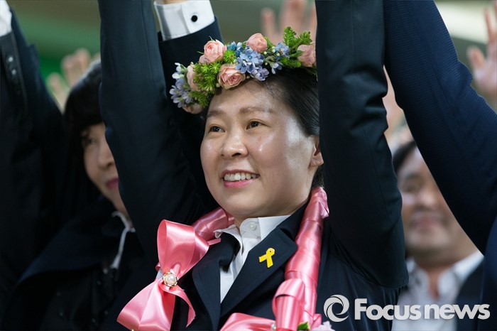 (서울=포커스뉴스) 13일 오후 10시35분 KBS는 광주 광산을의 개표가 41.0% 진행된 가운데 국민의당 권은희 후보가 51.0%를 득표해 당선이 확실하다고 밝혔다.권은희 국민의당 광주 광산구을 후보가 13일 오후 광주 광산구 수완동 선거사무실에서 당선이 유력해지자 지지자들과 환호하고 있다. 2016.04.13 김인철 기자