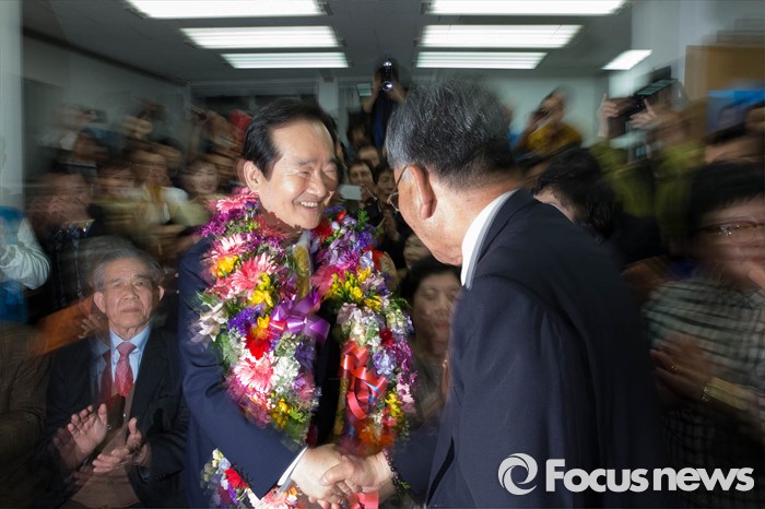 (서울=포커스뉴스) 제20대 국회의원선거일인 13일 오후 정세균 더불어민주당 종로구 후보가 서울 종로구 자신의 사무실에서 53.9%의 득표로 오세훈 새누리당 후보를 누르고 당선이 확실시 되자 세리머니를 하고 있다.