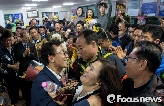 (부산=포커스뉴스) 전재수 더불어민주당 부산 북구강서구갑 후보가 13일 오후 부산 북구 선거사무소에서 당선이 확실시되자 지지자들과 함께 기쁨을 나누고 있다.