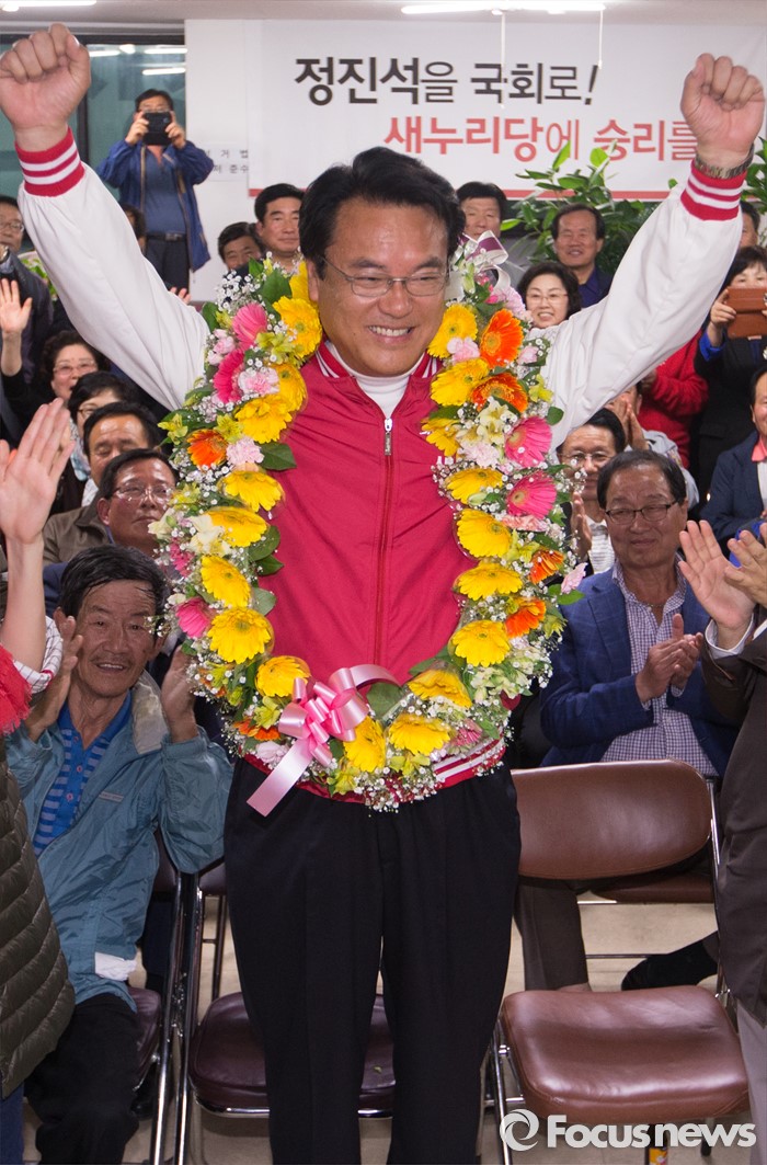 (공주=포커스뉴스) 제20대 충남 공주부여청양 국회의원에 당선된 정진석 새누리당 당선인이 13일 오후 충남 공주 선거사무소에서 환호하고 있다.