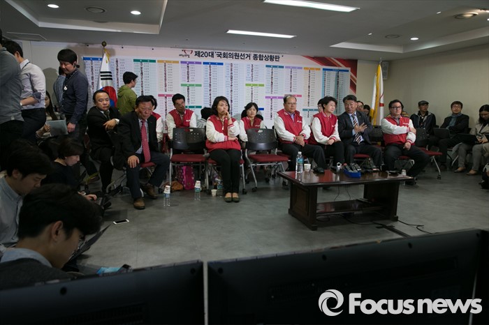 (서울=포커스뉴스) 제20대 국회의원 선거날인 13일 오후 서울 여의도 새누리당사에서 비례대표 후보들과 당직자들이 심각한 표정으로 개표방송을 시청하고 있다.