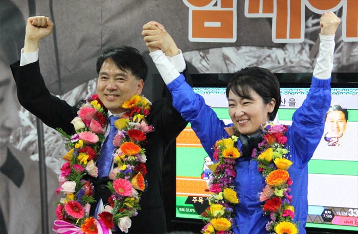 (서울=포커스뉴스) 20대 총선에서 당선이 확정된 이언주 더불어민주당 경기 광명을 후보가 13일 경기도 광명 자신의 선거캠프에서 지지자들과 손을 들어 기뻐하고 있다. <사진제공=이언주 후보 선거사무소>