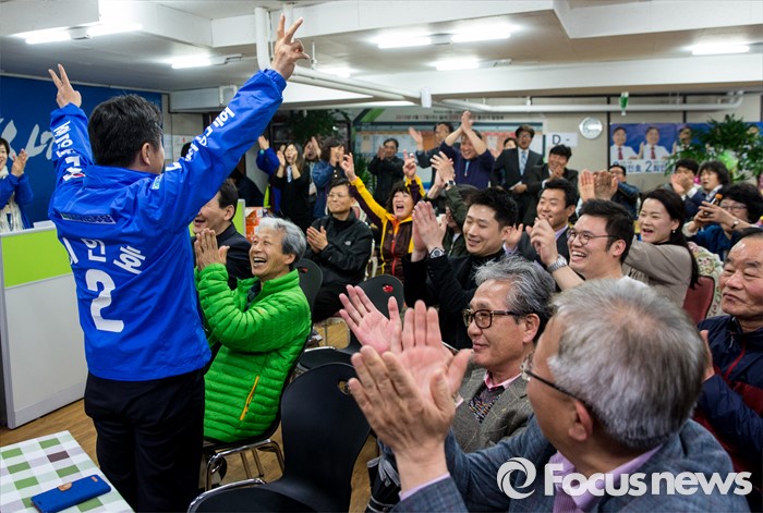 (부산=포커스뉴스) 최인호 더불어민주당 부산 사하구갑 후보가 13일 오후 부산 사하구 선거사무소에서 개표방송 결과 시청 도중 앞서고 있다는 소식에 지지자들과 기쁨을 나누고 있다.