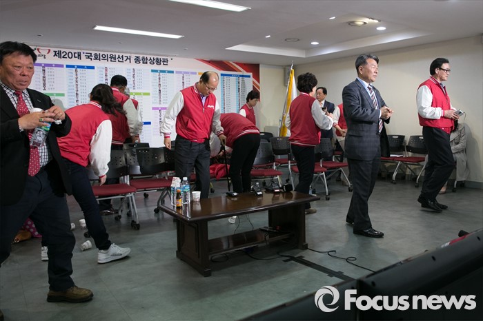 (서울=포커스뉴스) 제20대 국회의원 선거날인 13일 오후 서울 여의도 새누리당사에서 비례대표 후보들과 당직자들이 개표방송 시청을 마친 뒤, 자리를 떠나고 있다.