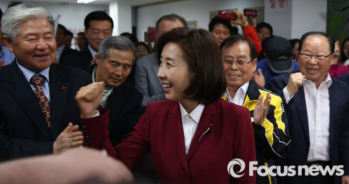 (서울=포커스뉴스) 제20대 국회의원 선거날인 13일 오후 서울 동작구에 위치한 선거사무실에서 나경원 새누리당 동작구을 후보가 지지자들에게 축하를 받고 있다.