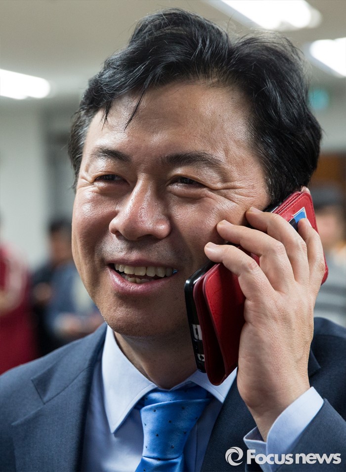 | △ 축하전화 받는 김영춘 |