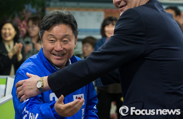 (부산=포커스뉴스) 최인호 더불어민주당 부산 사하구갑 후보가 13일 오후 부산 사하구 선거사무소에서 개표방송 결과 시청 도중 앞서고 있다는 소식에 지지자들과 기쁨을 나누고 있다.