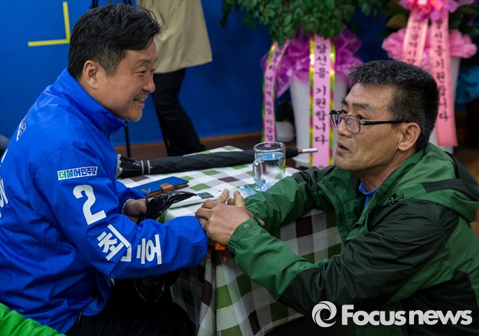 (부산=포커스뉴스) 최인호 더불어민주당 부산 사하구갑 후보가 13일 오후 부산 사하구 선거사무소에서 개표방송 결과 시청 도중 앞서고 있다는 소식에 지지자들과 기쁨을 나누고 있다.